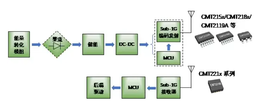 如下图所示,某卷帘门无线遥控方案的发射端就选用了无线发射芯片CMT2119A;而接收端则选用无线接收芯片CMT2219B,通过解调遥控指令输出给电机以开启卷帘门或关闭卷帘门。
