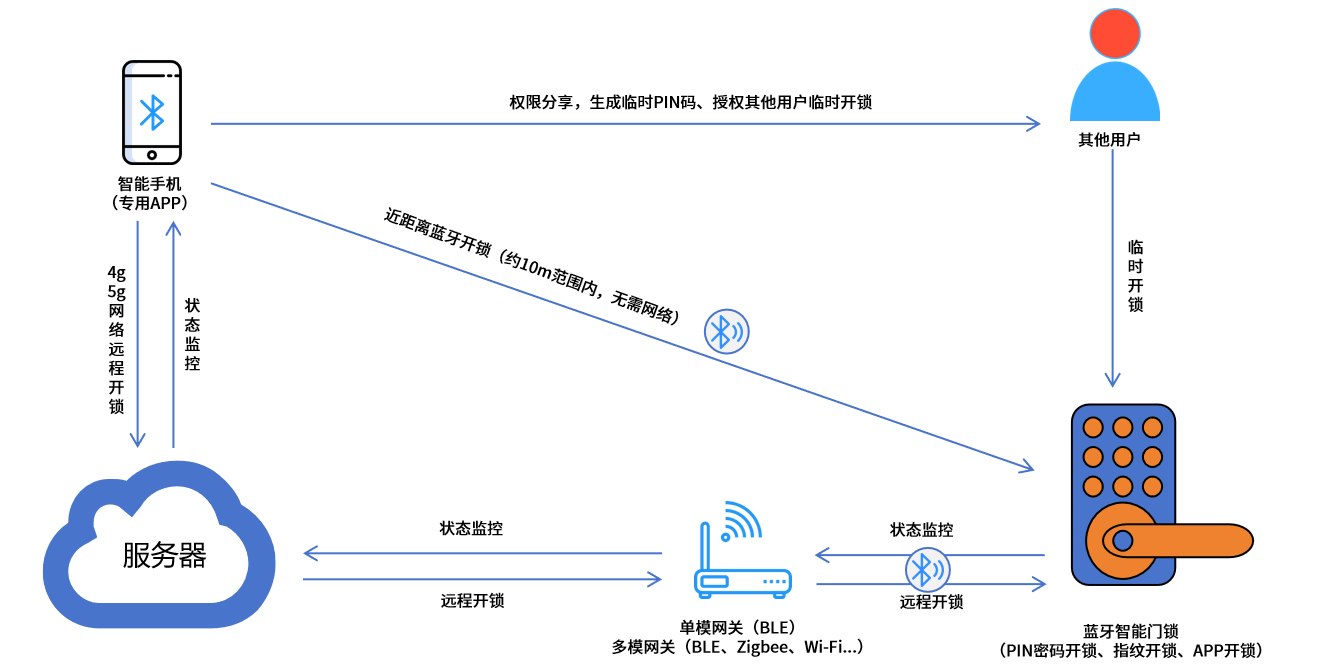 如下图所示,蓝牙智能门锁深度融合了BLE通信技术、生物识别及物联网功能,是一种新型的智能安防产品,可为用户提供更加安全、更加便捷的门禁管理方案。