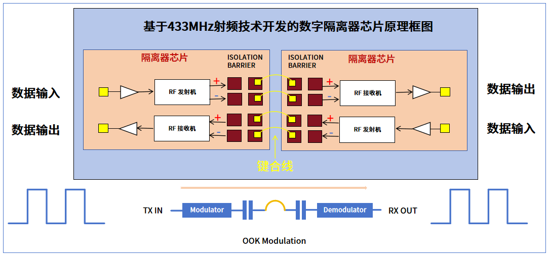 在此芯片框架中,射频发射端会将要进行传输的数字信号通过OOK调制为高频脉冲信号,而后经电容电场耦合至射频接收端,并通过OOK解调为初始的数据信号,从而在阻断电气连接的环境下实现数字信号的安全传输。
