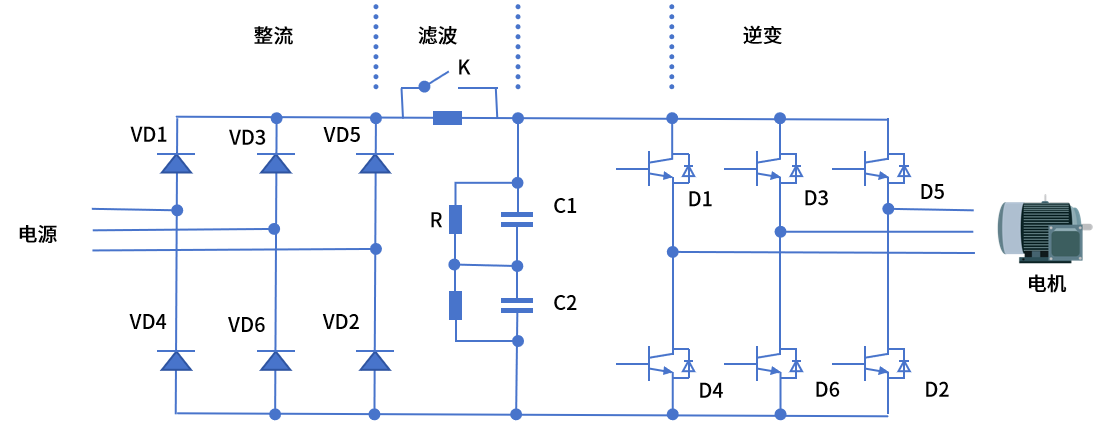 如上图所示,变频器是一个集成了整流、滤波、逆变等功能的完整电气装置,其工作原理为将工频交流电(如380V/220V、50Hz)整流为直流电,再通过滤波电路对整流后的直流电进行平稳化处理,最后通过逆变电路将平稳的直流电逆变为频率可调的交流电,从而改变交流电机的供电频率,实现电机的转速调节。