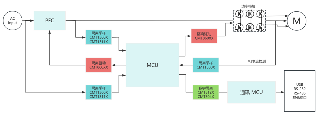 CMT130X等隔离采样芯片可应用在MCU与高压母线之间,能阻断母线高压向控制电路窜入的风险,同时还能有效抑制噪声干扰,对母线电压、电流等模拟信号进行采样,为MCU提供高精度的数字化采样数据,大幅提升系统可靠性。